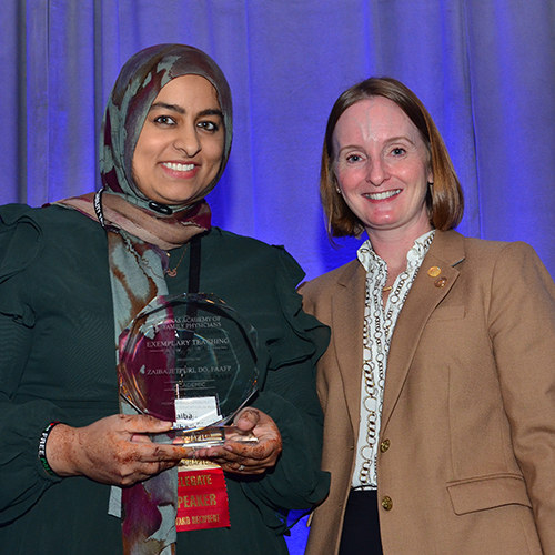 Zaiba Jetpuri, D.O., Associate Professor of Family and Community Medicine, recently received the Texas Academy of Family Physicians (TAFP) 2025 Academic Exemplary Teaching Award. Presented Nov. 15 during TAFP’s Annual Session and Primary Care Summit in Addison, Texas, the award recognizes individuals with outstanding teaching skills who have developed and implemented innovative teaching models.